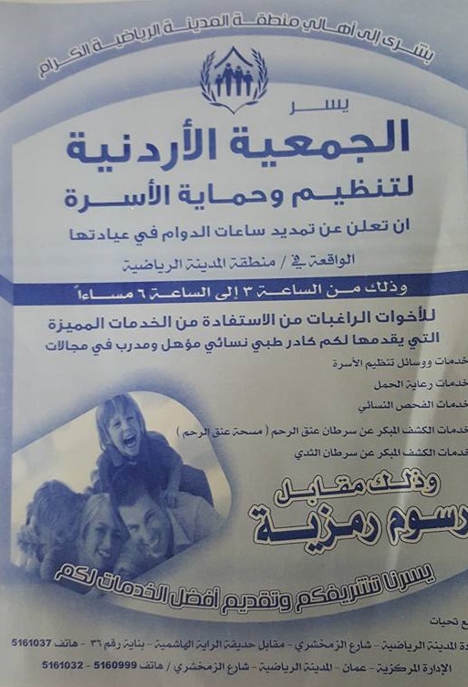 الجمعية الأردنية لتنظيم وحماية الأسرة تبدأ العمل واستقبال السيدات 3 ساعات مسائية في عيادتي المدينة الرياضية و بيادر وادي السير وذلك بعد عيد الفطر السعيد مباشرة و من الساعة الثالثة مساء وحتى السادسة مساء ثلاثة ايام في الاسبوع وهي السبت والاثنين وااربعاء ، ويأتي ذلك ضمن نشاطات الجمعية التي تهدف الى التسهيل على السيدات في تلك المناطق من أجل الحضور لتلقي الخدمات .